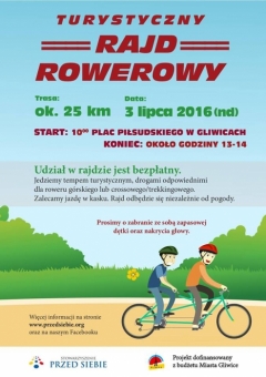 Rowerzyści pojadą drogą asfaltową, szutrową, gruntową i ścieżkami leśnymi. Organizatorzy zalecają rower górski lub crossowy/trekkingowy. Tempo trasy będzie turystyczne (ok. 10-15 km/h. - Celem nie jest jak najszybsze pokonanie trasy, a przejazd rekreacyjny ciekawymi terenami w Gliwicach i okolicach - wyjaśniają pomysłodawcy Rajdu. - Trasa wiedzie także w otwartym ruchu ulicznym, więc prosimy o zachowanie bezpieczeństwa na drodze. Zalecamy jazdę w kasku - dodają.