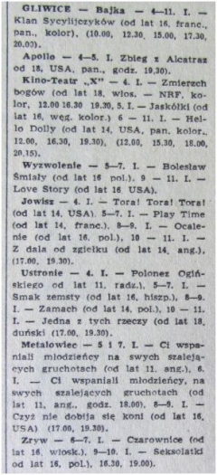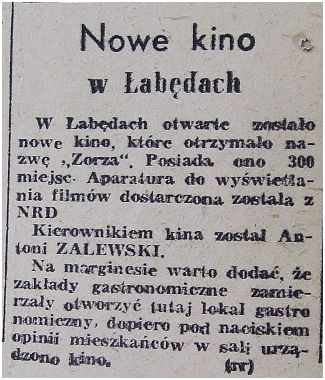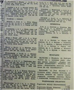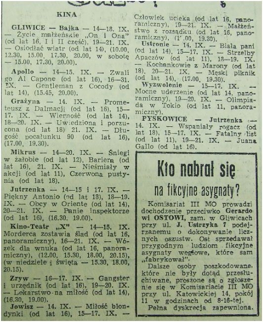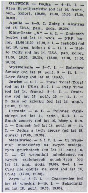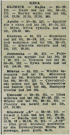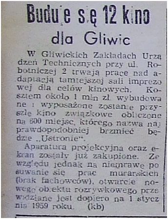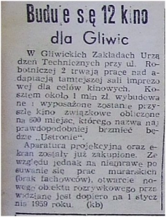 Ponadto w Gliwicach funkcjonowały również kina noszące nazwy Zryw, Ustronie, Wyzwolenie, Metalowiec. Swoje kino miała dzielnica Łabędy. W miejscowym Domu Kultury funkcjonowało kino – teatr.