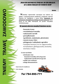 Wychodząc naprzeciwko otaczającej nas naturze, jej piękna i nieograniczonych możliwości, pragniemy zaprosić Państwa do współpracy z naszą firmą. Zajmujemy się pielęgnacją i kompleksową obsługą terenów zielonych. Nasza praca to nie tylko obowiązek, ale przede wszystkim wieloletnia pasja.